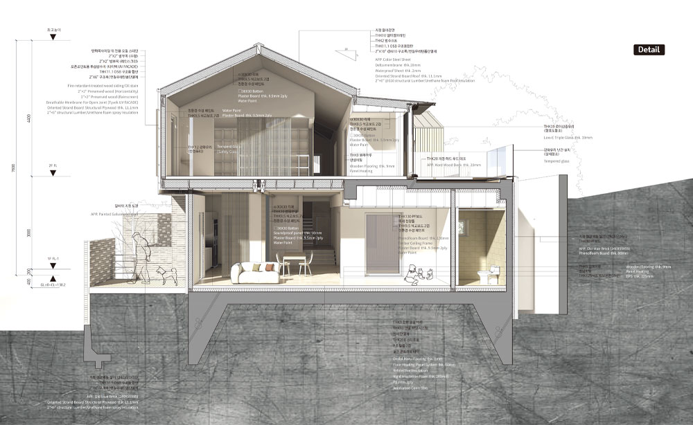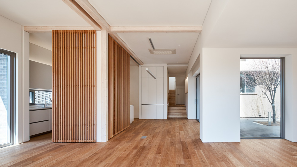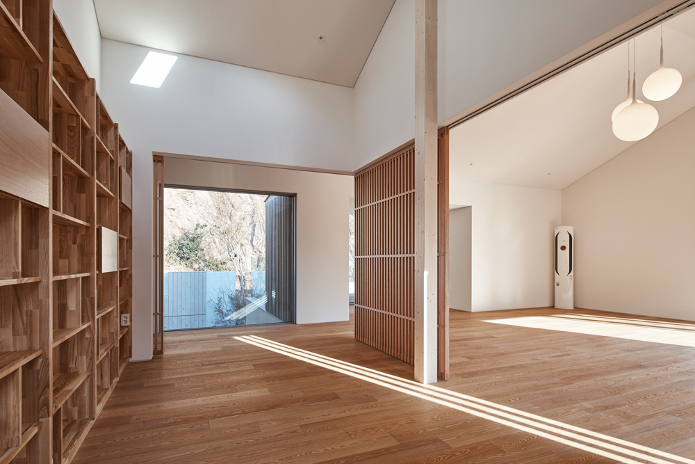 공학목재로 이뤄진 기둥과 보는 공간을 분절하고 통합하는, 일종의 ‘내재된 질서’이다. 내부공간은 경사진 대지의 형상을 따라 단차를 주어 중정으로 연결되도록 구성했다. 주방과 식당, 거실공간은 루버 슬라이딩 덧문으로 필요에 따라 직접적인 시선을 거를 수 있도록 하였다.