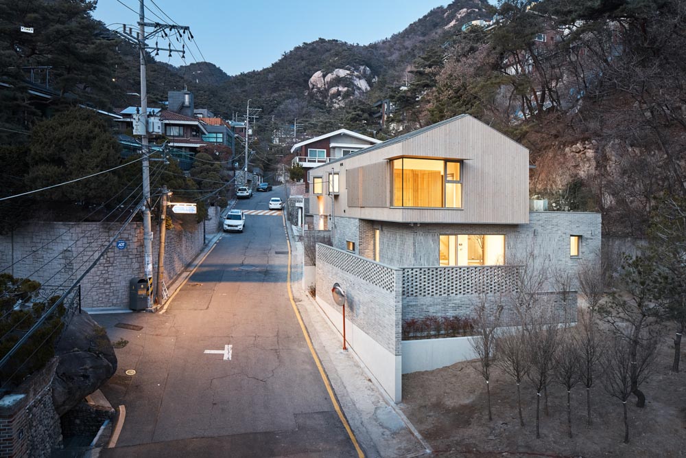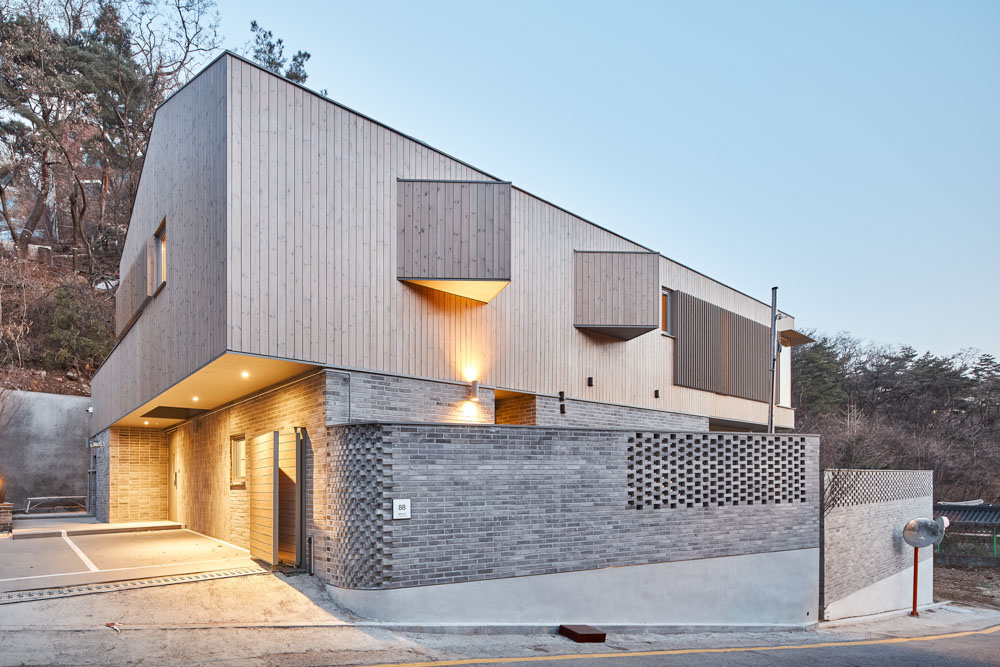 Bricks and wood, which are warm natural materials, are mainly used, but the places where the materials come into contact are carefully treated so that the constructive characteristics of each material can be well reflected. Each of these natural materials has the merit that its characteristic is more clearly revealed as the material is more weathered and shone with lighting. Considering the surrounding landscape and the houses, old bricks are used as the exterior material, while it was cut in half and stacked to reveal the cut section. Carbonized wood siding was used as an open joint in two different ways in the right place to add a sense of rhythm to the plain outside landscape.