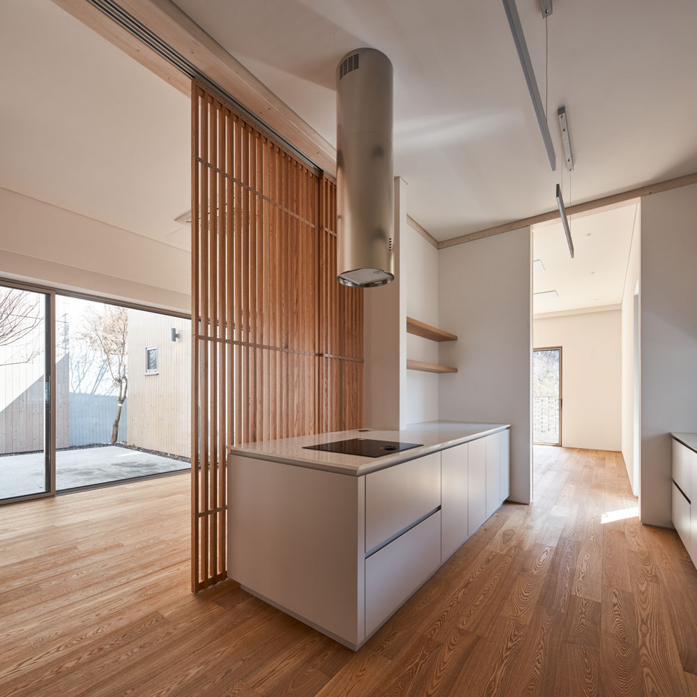 The pillars and beams, made of engineered wood, which divide the space and integrate it are a sort of ‘inherent order'. The interior space was designed to have several steps to shape along with the slope of the site and to be connected to the courtyard. From the kitchen, dining room, or living room, the direct gaze can be filtered by sliding louvered doors when needed.