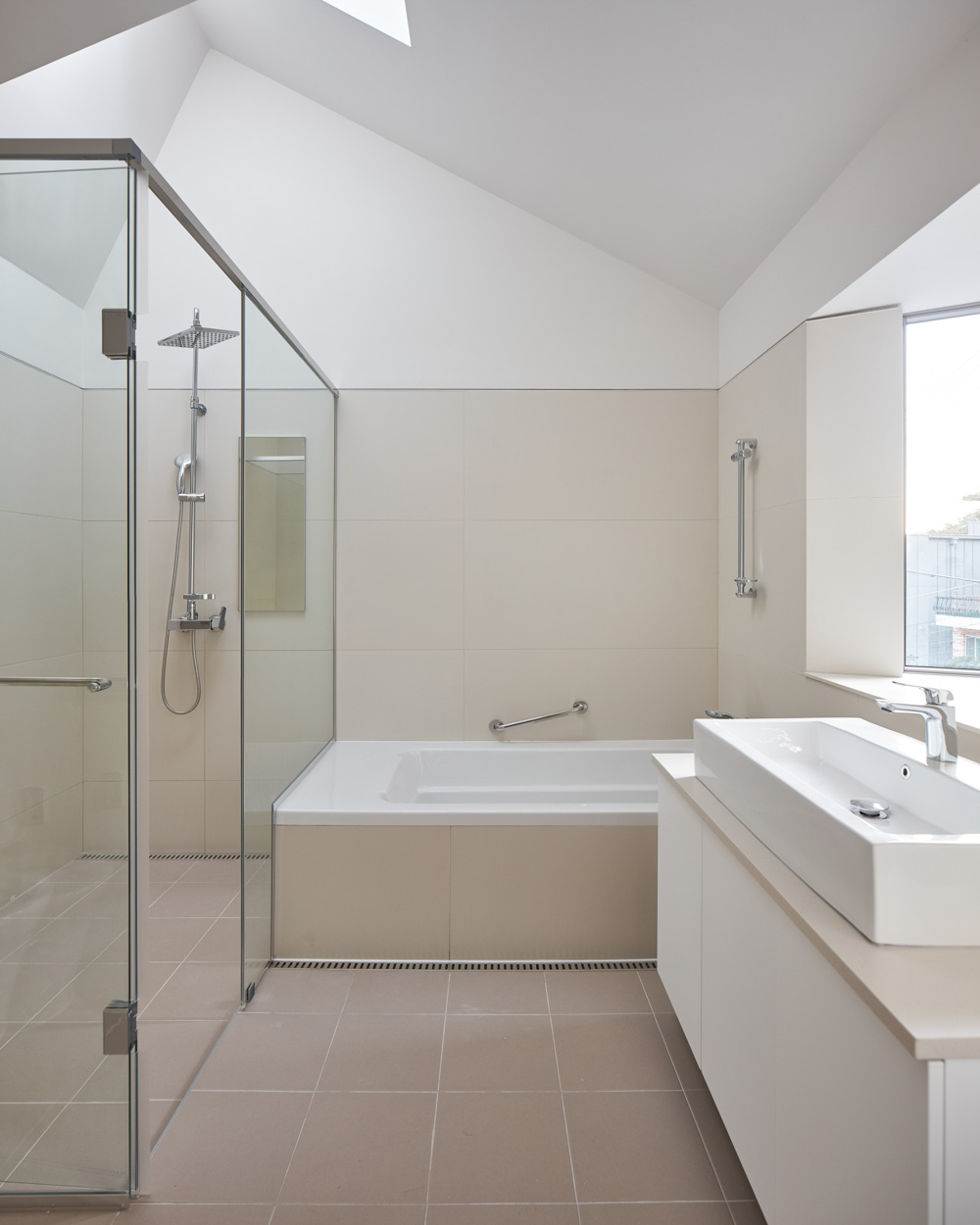 비비정(備比庭)은 자연과 가족의 일상이 부단히 교차하고 교감하는 ‘일련의 순간‘을 계획하고 조합하는 과정으로 그려갔다. 1개 층 높이의 옹벽을 존치한 상태에서 계획해야 하는 상황이라, 습기에 대응하고 충분한 자연환기가 이뤄질 수 있도록 옹벽 쪽의 1층 매스는 철근콘크리트로 계획하였다. 또 그렇게 구성된 철근콘크리트 보를 중목구조의 기둥, 보와 2층 바닥장선과 합성구조로 활용하였고, 그 위에 경량목구조로 2층과 지붕을 구성하였다. 목구조로는 상대적으로 취약할 수 있는 옹벽과 베란다, 테라스 등 외부 평슬라브 부분은 철근콘크리트구조로 풀어내고, 그 구조를 활용하여 목구조를 하이브리드화하는 방식으로 구조를 계획하였다. 지붕구조는 1층으로부터 연속한 수직기둥에 기댄 ridge beam 구조방식이어서 내부공간의 질서로부터 자유롭게 천장을 구성할 수 있었다. 리듬감 있게 흐르는 대지의 방향을 따라 구성된 꺾인 지붕선은 간결한 형태 언어를 가진다.