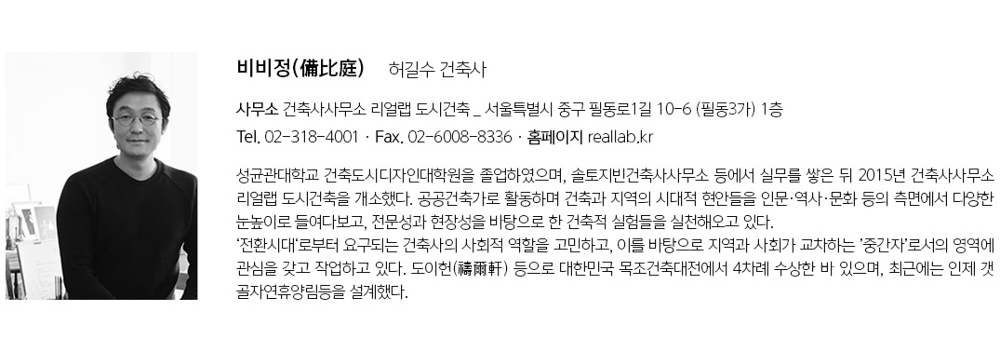 남북방향으로 세장하게 꺾인 형상의 부정형한 경사대지가 주는 계획의 한계는 계획과정의 수고로움을 예고했다. 비비정(備比庭)은 어쩌면 이러한 일련의 제한된 조건들을 계획의 ‘단서’로 재해석하고 치환하는 과정의 결과물인지도 모르겠다.