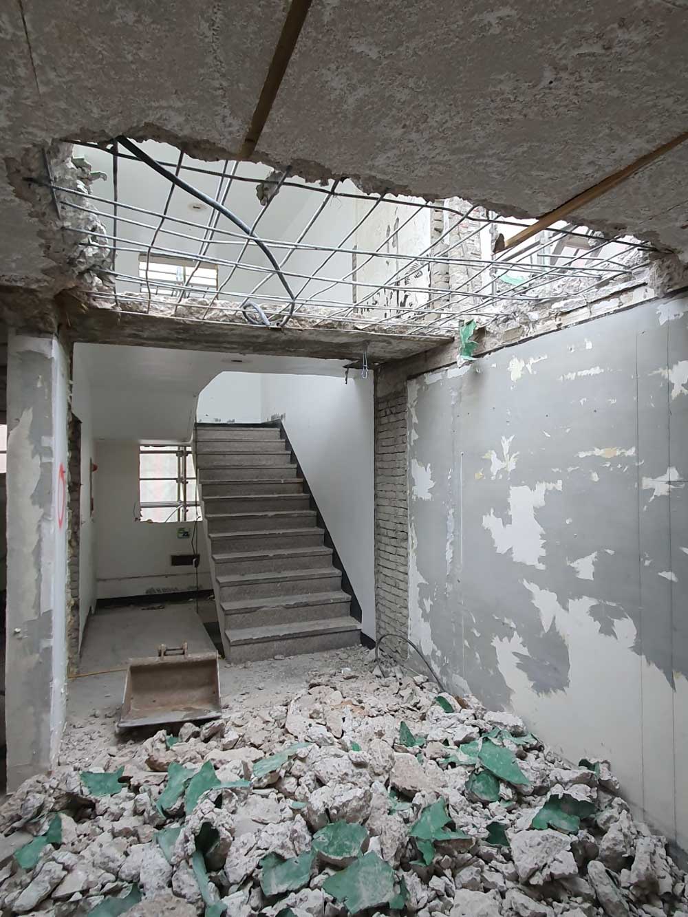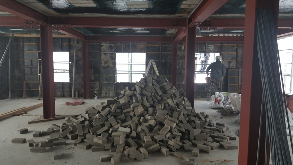 기존 화장실 전면 위치를 엘리베이터 후면인 내부로 변경하고, 그 자리에 엘리베이터를 삽입하기 위한 철거 및 구조 보강공사가 장기간 진행되었다. 내부 공간의 효율성을 극대화하기 위해 대공간을 만들어야 했고, 구조기술사와 함께 구조보강은 최대한 외벽 쪽으로 구성하도록 하였다. 도로 사선제한도 적용받지 않기 때문에, 그 부분을 철거하고 새로이 벽체를 구성하여 오롯한 존재감을 위해 입방체의 형상을 만들고자 하였다.