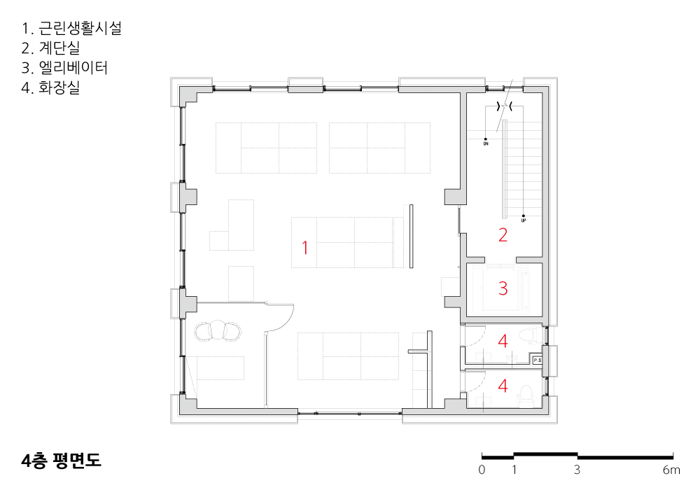 전체의 통일된 입면 구축을 위해 기존의 불규칙한 개구부들의 일부는 채우고, 어느 곳은 절개하여 개구부 창호의 균질성을 확보해 입방체의 가치를 보좌할 수 있도록 의도하였다. 전 층의 전기, 통신, 설비도 새로운 경로를 통해 모두 재설정하였다.