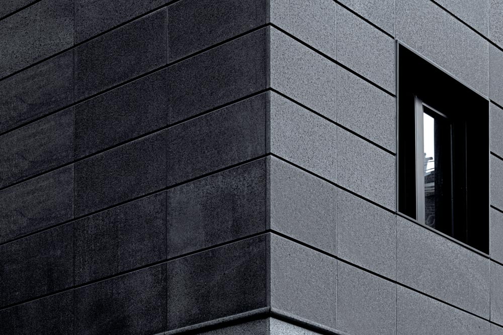 서교동이라는 격자형 도시 속에서 대지에 강한 존재감으로 자리 잡도록 하기 위해 외관은 묵직한 마천석으로 제안했다. 저층부는 플라워카페의 이미지를 반영하고, 상층부의 매스감을 돋보이게 하기 위해 마천석보다 밝은 고흥석으로 외피구성을 하였다. 입면의 명도 차이를 통해 콘트라스트를 구현하면서, 부유감을 부여하려고 하였다. 모든 석재는 가로메지만 강조하기 위해 상부 쪽을 45도 커팅하여 시공하였다.