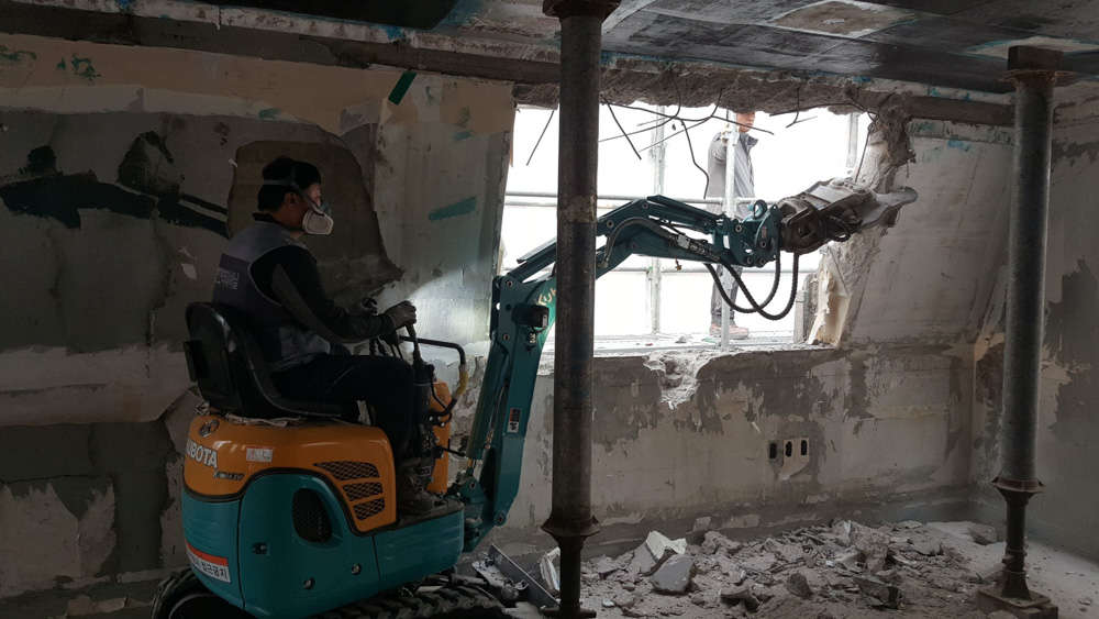 The demolition and structural reinforcement work was carried out for an extended period to change the front of the existing toilet to the interior, the rear of the elevator, and install the elevator. Also, to maximize the efficiency of the indoor space, ample space was created. The structure was reinforced toward the outer wall as much as possible in consultation with the structural designer. Since it was exempted from setback regulation from road width, we planned to demolish the part and construct a new wall to make it cube-shaped for its complete presence.