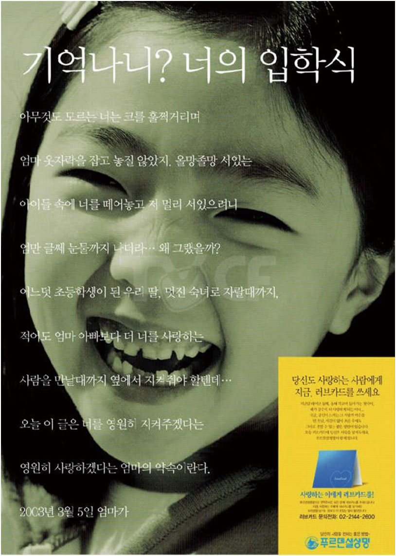 아이를 초등학교에 보내는 엄마 마음은 어느 나라나 비슷한 것 같다. 우리나라에도 초등학교 입학식을 소재로 삼은 비슷한 광고가 있었다. 2003년 만들어진 푸르덴셜생명의 신문광고이다. 활짝 웃는 초등학생 여자 아이의 얼굴 위로 엄마의 마음을 담은 편지가 보인다.