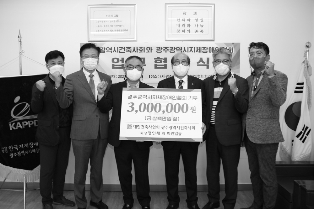 광주광역시건축사회는 5월 25일 광주광역시 지체장애인협회에서 진행된 업무협약 체결식에서 지체장애인들의 편의시설 확대에 사용해달라며 300만 원을 기부했다.