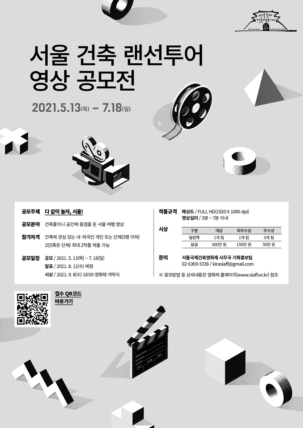 자세한 사항은 서울국제건축영화제 홈페이지(www.siaff.or.kr)를 참고하거나, 서울국제건축영화제 사무 국 기획홍보팀(02-6369-3336/kirasiaff@gmail.com)으로 문의하면 된다.
