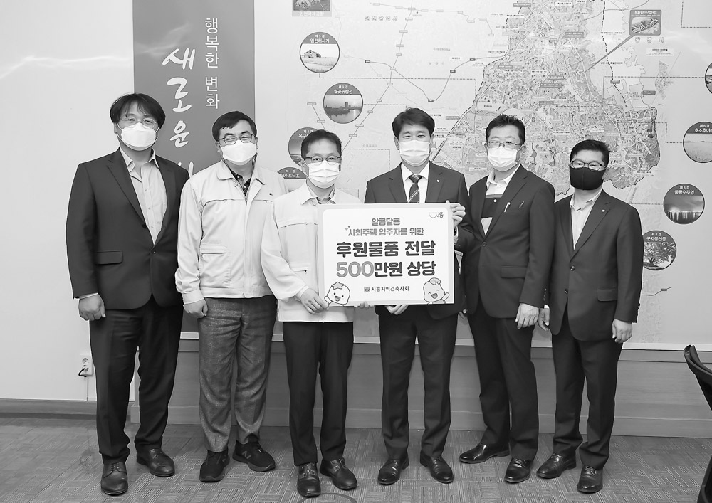 경기도건축사회 시흥지역건축사회는 5월 28일 시흥시청 부시장실에서 신천동 ‘알콩달콩 사회주택’ 주민들 을 위해 입주민 커뮤니티 활용에 필요한 500만 원 상당의 물품을 전달했다.이날 전달식에는 시흥지역건축 사회 이성원 회장과 이남수 부회장이, 시흥시에서는 연제찬 부시장 등이 참석했다. 연제찬 부시장은 “저소 득층 등 주거약자의 주거환경 개선을 위해 끊임없이 살피고 최선을 다해 기부활동을 한 시흥지역건축사회 회원에게 감사하다”며 “단체와 기업의 많은 지원과 후원으로 나눔 문화가 정착되고, 따뜻한 공동체 의식이 확산되기를 희망한다”고 말했다.이성원 시흥지역건축사회장은 “나눔활동에서 가장 중요한 것은 지속적인 기부와 봉사”라고 강조하며 “앞으로도 시흥지역건축사회는 지역사회의 든든한 동반자로서 다양한 사회공 헌 활동으로 시흥시의 아름다운 변화를 만들어가는 데 동참할 것”이라고 말했다.