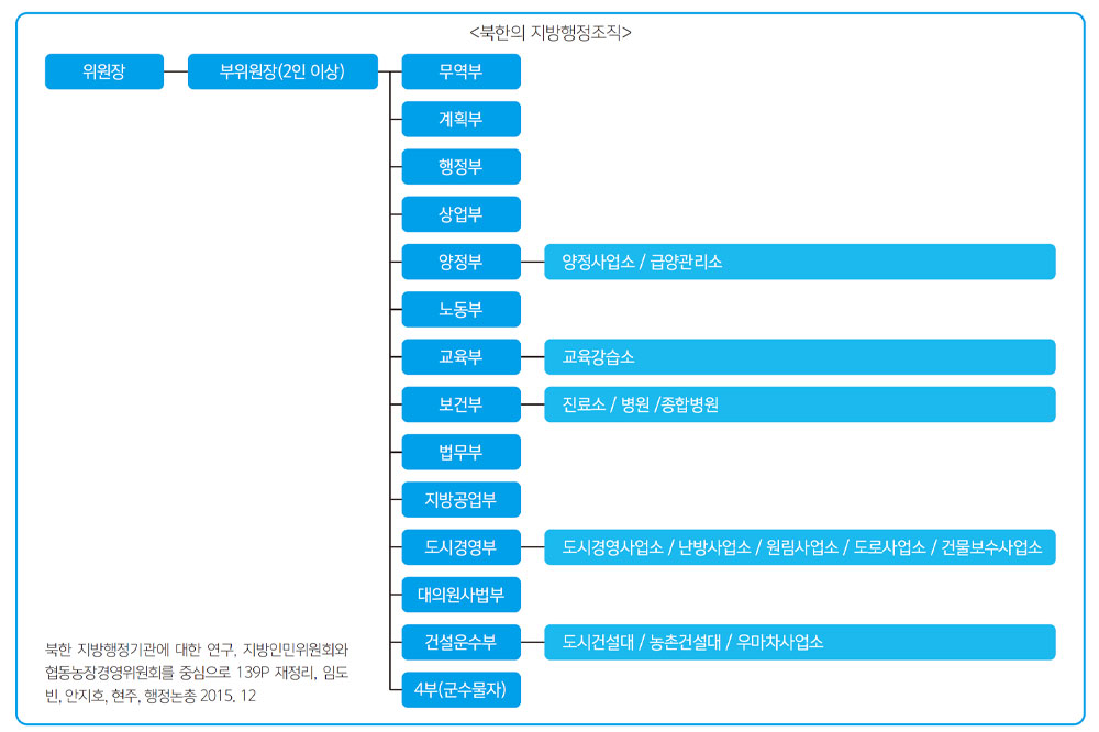 북한은 사회주의 국가 특유의 중앙집권적인 통치구조로 되어 있으나, 남한의 지방의회와 자치단체에 해당하는 조직이 있다. 이러한 지방조직은 북한의 건국 초기부터 운영되어왔다.