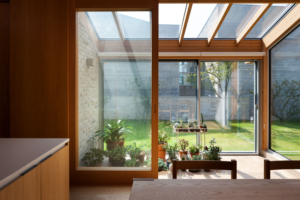 In front of the dining room, a greenhouse with an indoor courtyard is designed to bring nature inside and make the space transparent and relaxed. As external electric blinds are installed above the greenhouse, you can control them to suit the weather or mood.