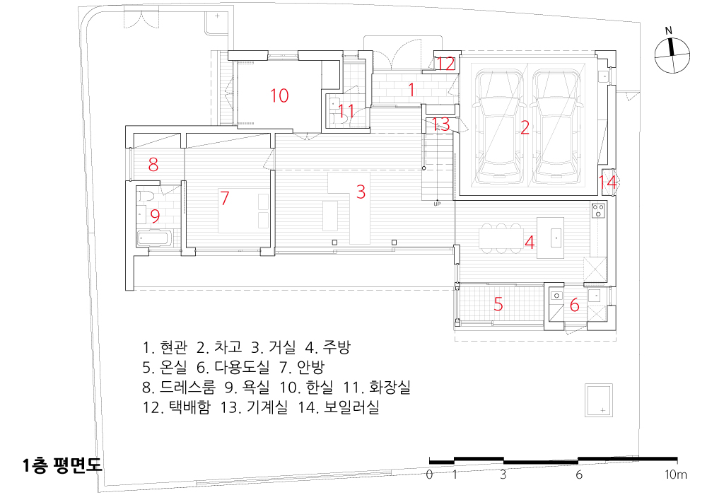 여러 개념과 모양으로 배치안을 검토하였으나, 대지의 여건을 잘 아는 건축주의 요구로 일조검토를 철저히 하여 ‘일조에 유리한 일자형 배치’로 방향을 잡았다. 부부침실-거실-식당-부엌이 전면에 늘어서고 그 뒤로 한실손님방-현관-차고가 붙는 모양을 하였다. 식당에는 앞에 온실과 유틸리티를 덧붙이고, 2층에는 거실을 중심으로 서재-거실-아들방을 일자로 구성하였다. 동서로 긴 대지의 형상과도 어울려 어디서나 빛이 풍부하고 계절의 변화를 느낄 수 있는 집이 되었다.