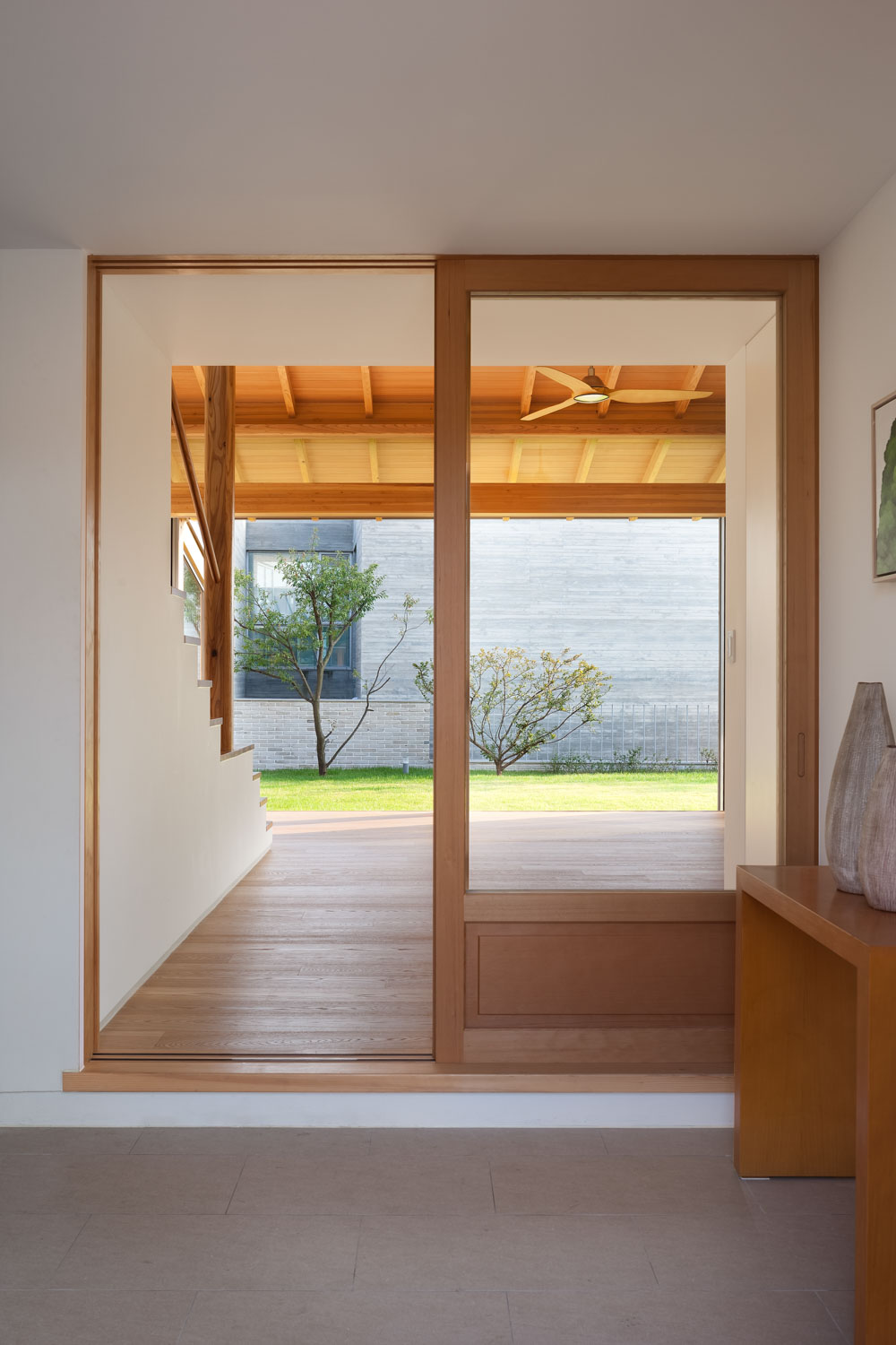 평면은 단순하지만, 문을 열고 집으로 들어서는 공간의 체험은 안정된 시선을 유지하면서 여유 있게 시작하여 그 끝에는 선명하고 극적으로 느낄 수 있도록 전체를 조율하였다. 현관에 들어서면 좌우로 넓은 폭의 공간이 나타나고, 중문은 문프레임이 드러나지 않게 정리하여 공간에 집중하게 했다. 무엇보다 현관에서 거실, 마당으로 아무것도 없는 ‘비어있는 축’을 두어 사람을 이끌어, ‘시원하게 열린 거실과 밝은 마당’을 만나도록 계획하였다. 가능하다면 하나의 장면이 아니라 진입의 과정과 체험으로 이 집이 기억되길 바랐다.