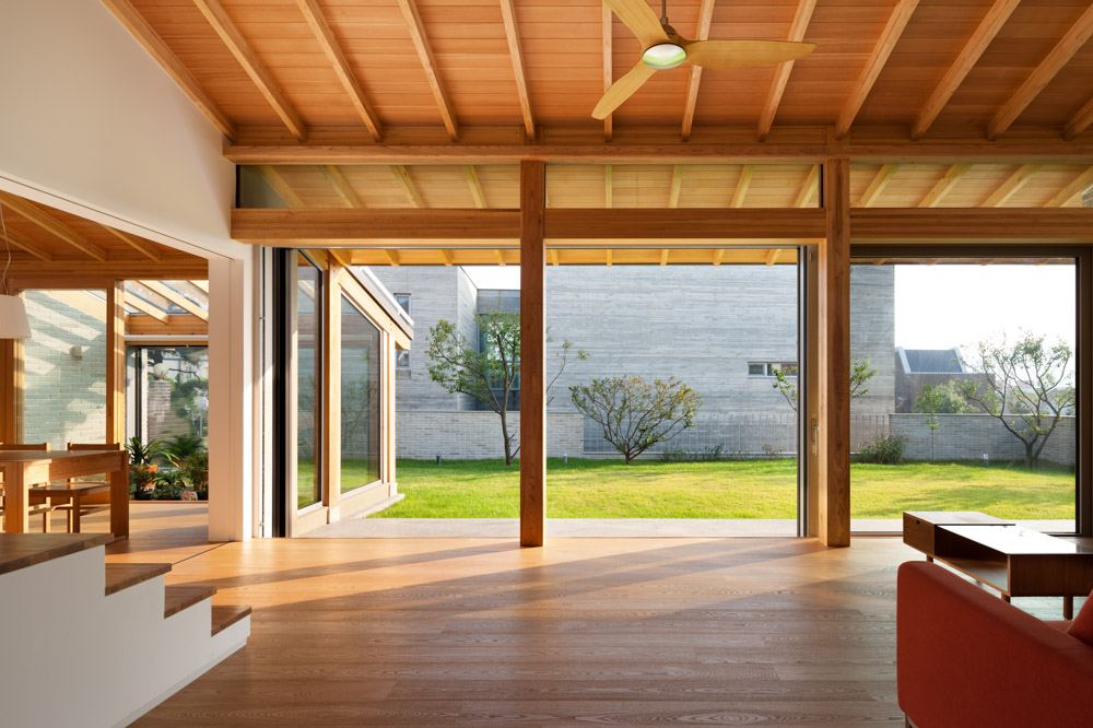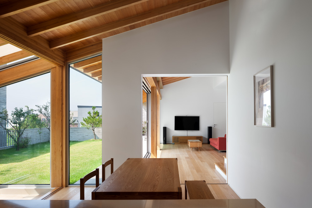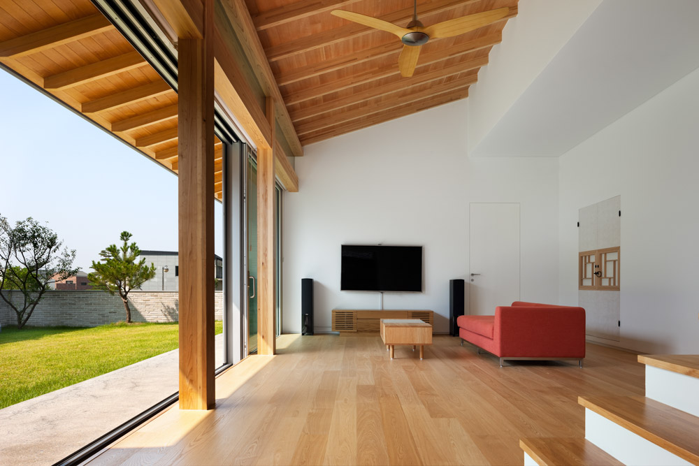 시원하게 열려 있는 3칸 대청을 생각하며, 기둥, 도리, 서까래 등을 현대의 중목구조 부재로 바꾸어 3칸 거실로 계획하였다. 안팎의 경계가 없는 투명한 공간감, 3칸 입면의 품격과 전통미가 느껴지면서 우리 시대에 맞는 여유와 아름다움을 지닌 거실을 만들려 하였다. 시스템 창호를 목구조면 뒤로 숨기고, 상부창을 투명하게 하여 서까래의 흐름이 끊기지 않고 이어져 보이게 하였다. 거실에 들어서면 3칸의 기둥과 보만 눈에 띄어 민가의 대청처럼 ‘열려 있는 느낌’이 들도록 하였다. 경험하는 사람에 따라서는 다시 밖으로 나온 듯한 느낌을 받을 만큼 마당과의 경계를 사라지게 하였다.