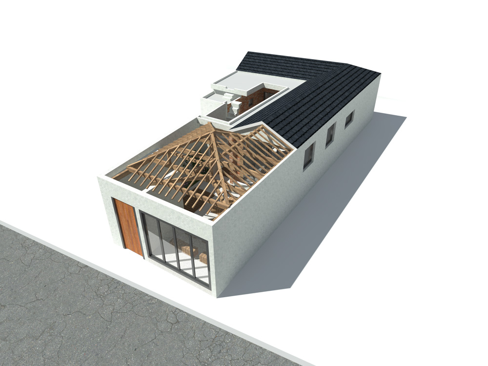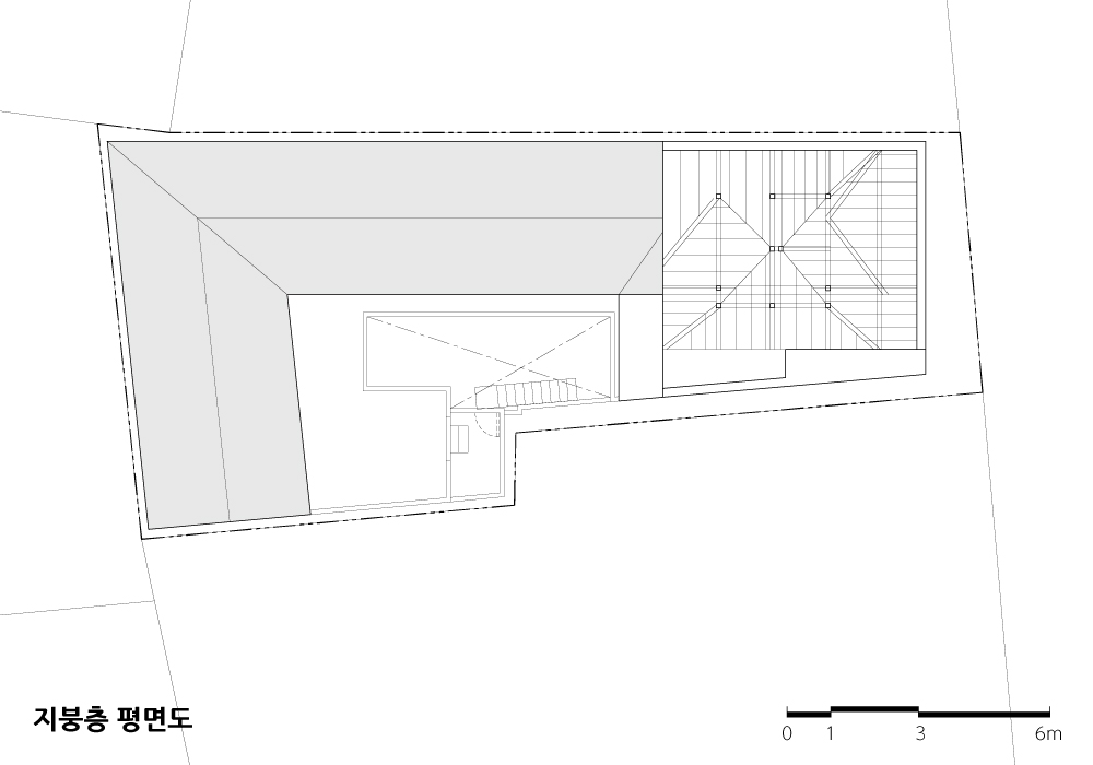 지붕은 일본식 중목구조로 틀이 형성되어 있어 그 뼈대를 드러내기 위한 작업이 공사의 중요한 부분이 된다. 마당의 지붕을 철거하고 보니 60년이 된 목재틀은 재사용이 불가능할 정도로 훼손되어 있어 그 형태를 유지하며 새로운 목재로 뼈대를 형성했다.