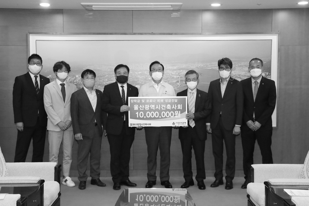 울산광역시건축사회는 6월 3일 울산광역시청에서 송철호 시장과 한시준 울산사회복지공동모금회 회장이 참석한 가운데 코로나 피해 극복 지원 및 대학생 장학금 1,000만 원을 전달했다.