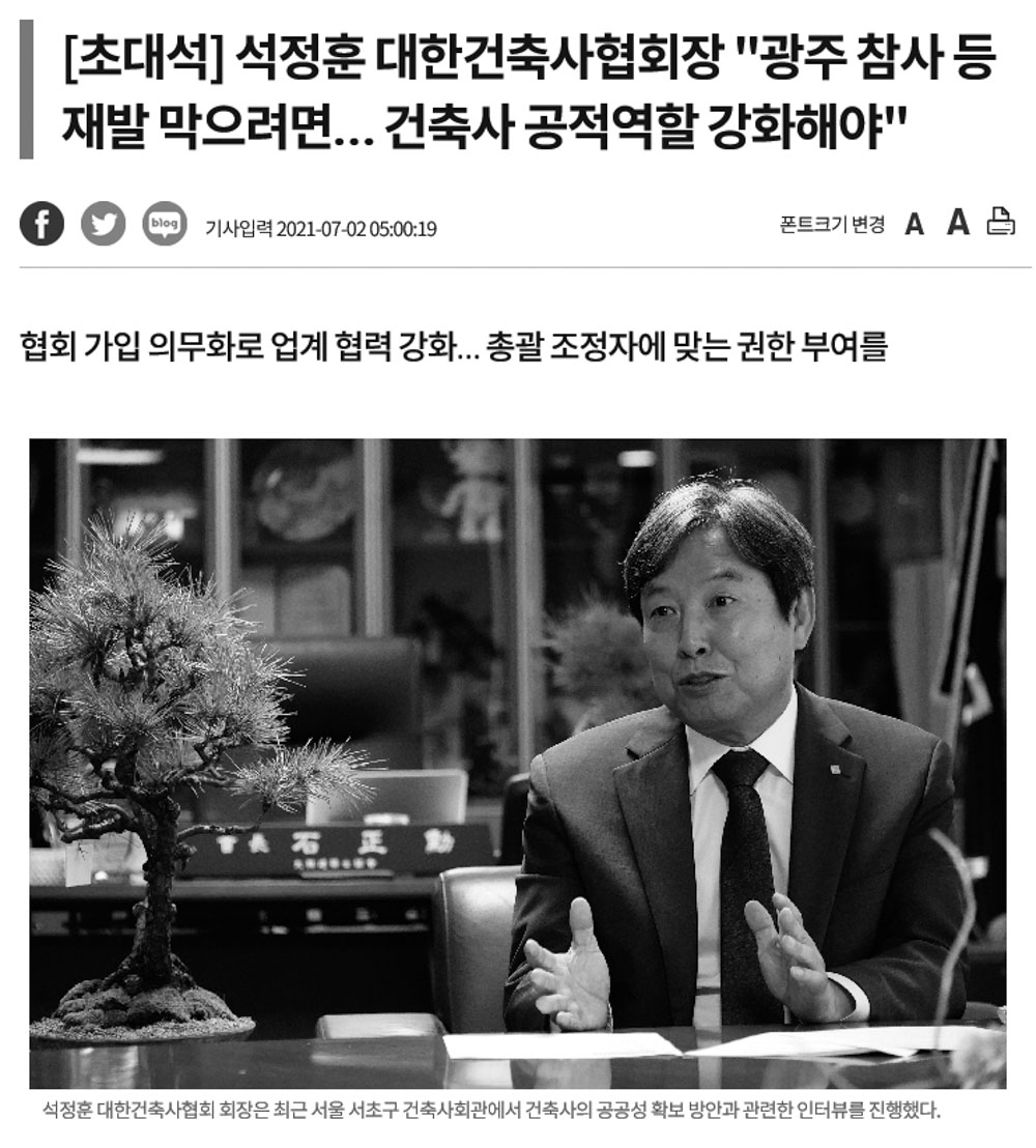 건축사의 공공성 확보 방안과 관련한 석정훈 대한건축사협회 회장의 인터뷰가 ‘e대한경제’지에 수록됐다(“철거→해체로 패러다임 시프트… 건축사 공적역할 강화해야”, e대한경제, 2021.07.02.). 보다 앞선 6월 말에는 ‘서울경제’와 인터뷰를 진행했다(“협회 의무가입, 건축 공공성 강화 계기될 것”, 서울경제, 2021.06.27).