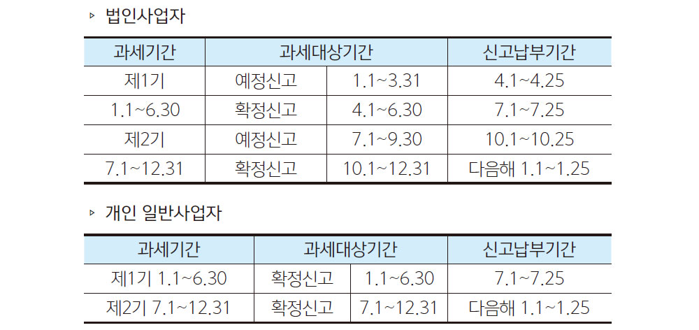 부가가치세는 6개월을 과세기간으로 하여 신고 납부하게 되며, 각 과세기간을 다시 3개월로 나누어 예정신고와 확정신고를 한다. 일반과세자는 1월 1일~6월 30일을 제1기 과세기간, 7월 1일~12월31일을 제2기 과세기간으로 하여 각각의 과세기간별로 신고 납부한다. 법인사업자는 1년에 4회, 개인사업자는 2회 신고한다.
