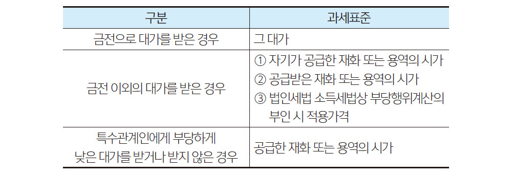 재화 또는 용역의 공급에 대한 부가가치세 과세표준은 해당 과세기간에 공급한 재화 또는 용역의 공급가액을 합한 금액으로 한다. 여기서 공급가액은 다음의 가액을 말한다.