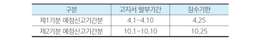 ▹ 예정고지세액 고지서 발부기간 및 예정고지 징수기한