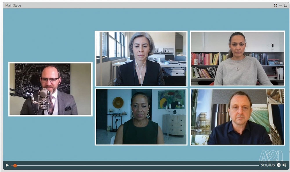 AIA Conference on Architecture는 미국건축사협회의 대표적인 연례 건축•디자인 행사이다. 전 세계 건축계, 디자인과 그 외 분야 지도자들이 한 자리에 모여 다가올 해를 정의하고, 전망하기 위한 만남의 장이다. 금번은 어려운 경제상황 속에서 고전하고 있는 건축업계를 돕기 위해서, 지난해 성공적으로 어려움을 극복한 기업 경영인들의 얘기를 듣는 자리가 모색되었다. 올해 행사인 A’21(AIA Conference on Architecture 2021)은 코로나 팬데믹으로 말미암아 미국건축사협회(AIA)에서 최초로 전면 버추얼 콘퍼런스로 개최되었다. 첫날 초기에는 잠깐 동안 온라인상 지연 등의 기술적인 문제가 발생하였으나, 곧 이를 해결하여 순조롭게 진행되었다.