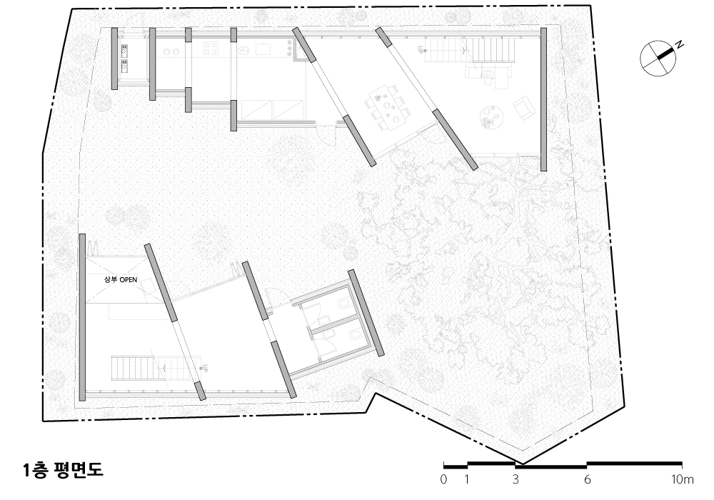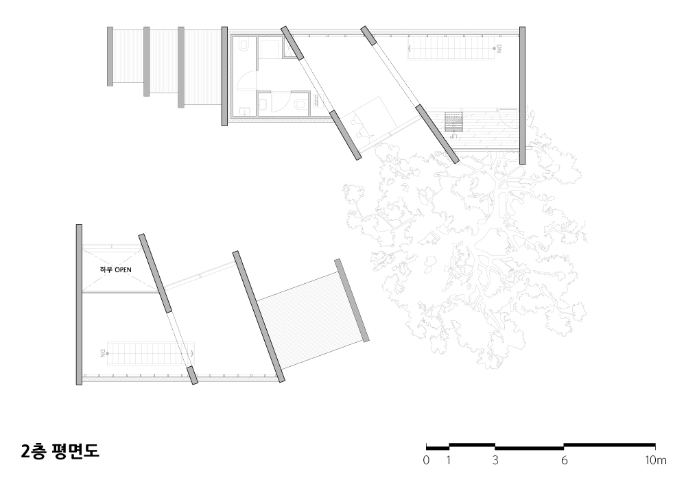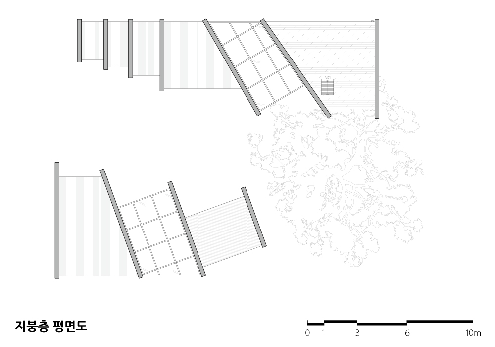 이렇게 참나무가 주인으로 오랫동안 존재해오던 대지에, 건축주는 이 참나무와 더불어 살 수 있는 공간을 만들고자 하였다. 그리고 이 땅의 주인이 오랫동안 참나무였으니, 건축이 만들어지더라도 참나무가 여전히 주인공이었으면 좋겠다고 생각하였다.