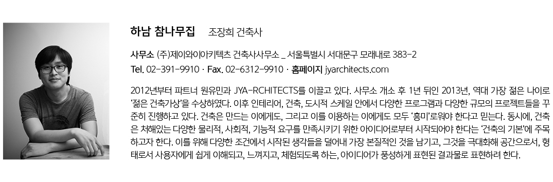 | 하남 참나무집 설계자 | 조장희 · 원유민(네덜란드 건축사) _(주)제이와이아키텍츠 건축사사무소 건축주 | 개인 감리자 | (주)제이와이아키텍츠 건축사사무소 시공사 | 건축주 직영 설계팀 | 성지은 대지위치 | 경기도 하남시 학암로 41 주요용도 | 단독주택 / 근린생활시설 대지면적 | 407.00㎡ 건축면적 | 119.82㎡ 연면적 | 197.46㎡ 건폐율 | 29.44% 용적률 | 48.52% 규모 | 지상 2층 구조 | 철근콘크리트구조 외부마감재 | 콘크리트 노출 면보수, 갈바륨 C형 골강판 내부마감재 | 지정합판 위 바니쉬 2회 도장, 콘크리트 노출 면보수 설계기간 | 2018. 08 – 2019. 03 공사기간 | 2019. 04 – 2019. 10 사진 | 원유민 _ (주)제이와이아키텍츠 건축사사무소 구조분야 : 한길구조 엔지니어링 기계설비분야 : 정연 엔지니어링 전기분야 : 정연 엔지니어링 소방분야 : 정연 엔지니어링 |