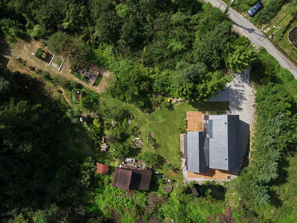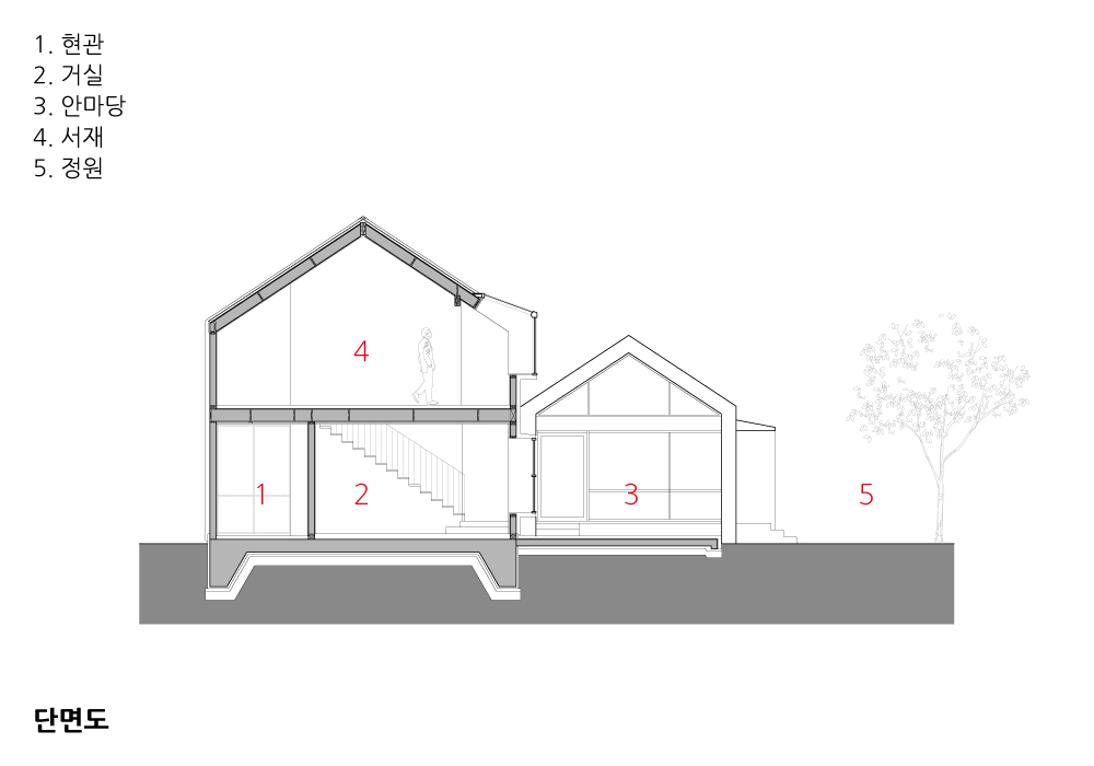 원형질의 가장 단순한 형태로 기능을 담고자 했다. 오두막 형태의 볼륨 두 개가 나란히 붙어 그 원초성이 주는 아우라로 땅에 단단히 서 있다. 외부에 면한 무뚝뚝한 큰 매스를 돌아서 땅 안쪽으로 들어오면 작고 밝은, 개방적인 매스를 볼 수 있다. 이 작은 셸터는 정원의 기능을 담고 낮 시간대 집안의 베이스캠프 역할을 한다. 정원 일을 하고 밥을 짓고 식사를 하고 그림을 그린다. 햇빛을 찾아, 그늘을 찾아 들락날락 자연과 셸터 사이를 오가다 보면 어느새 어둠이 찾아올 것이다. 어둠이 좀 더 짙어지면 부부는 좀 더 견고하고 폐쇄적이며 아늑한 큰 셸터로 들어가서 밤 시간을 즐길 것이다. 외부재료는 벽과 지붕을 동일한 재료로 선정, 셸터의 성격을 더욱 부여하고자 했다. 은색의 천연슬레이트는 날씨에 따라 색을 달리하는 모던한 소재로 외관의 단순한 형태를 구현하는데 적합했다.