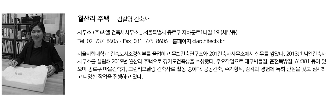 | 월산리 주택 설계자 | 김길영 _ (주)씨엘 건축사사무소 건축주 | 조은순 감리자 | 김길영 _ (주)씨엘 건축사사무소 시공사 | 윤형근 설계팀 | 김유제 대지위치 | 경기도 양평군 지평면 월산리 주요용도 | 단독주택 대지면적 | 698.00㎡ 건축면적 | 134.75㎡ 연면적 | 198.91㎡ 건폐율 | 19.31% 용적률 | 28.50% 규모 | 지상 2층 구조 | 목구조 외부마감재 | 천연슬레이트, 스터코 내부마감재 | 규조토페인트, 합판마루 설계기간 | 2018. 02 – 2018. 07 공사기간 | 2018. 08 – 2018. 12 사진 | 노경 구조분야 : 금나구조기술사사무소 기계설비분야 : (주)부윤엔지니어링 전기,분야 : (주)부윤엔지니어링 소방분야 : (주)부윤엔지니어링 |