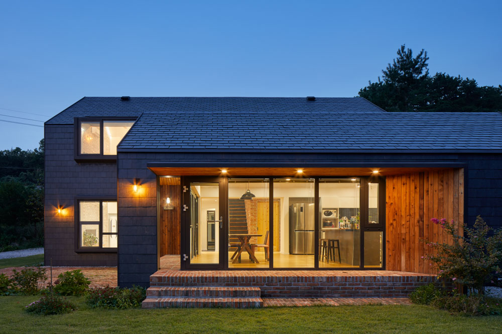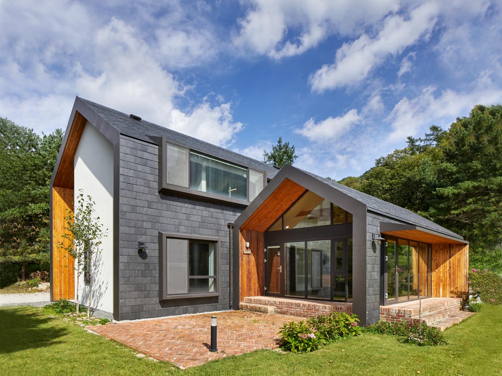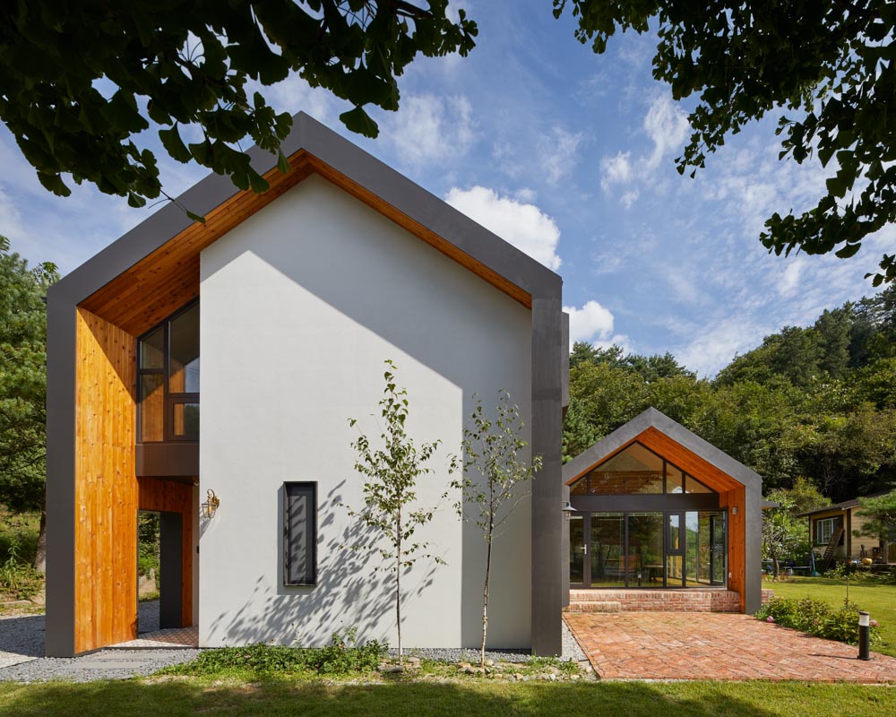 원형질의 가장 단순한 형태로 기능을 담고자 했다. 오두막 형태의 볼륨 두 개가 나란히 붙어 그 원초성이 주는 아우라로 땅에 단단히 서 있다. 외부에 면한 무뚝뚝한 큰 매스를 돌아서 땅 안쪽으로 들어오면 작고 밝은, 개방적인 매스를 볼 수 있다. 이 작은 셸터는 정원의 기능을 담고 낮 시간대 집안의 베이스캠프 역할을 한다. 정원 일을 하고 밥을 짓고 식사를 하고 그림을 그린다. 햇빛을 찾아, 그늘을 찾아 들락날락 자연과 셸터 사이를 오가다 보면 어느새 어둠이 찾아올 것이다. 어둠이 좀 더 짙어지면 부부는 좀 더 견고하고 폐쇄적이며 아늑한 큰 셸터로 들어가서 밤 시간을 즐길 것이다. 외부재료는 벽과 지붕을 동일한 재료로 선정, 셸터의 성격을 더욱 부여하고자 했다. 은색의 천연슬레이트는 날씨에 따라 색을 달리하는 모던한 소재로 외관의 단순한 형태를 구현하는데 적합했다.