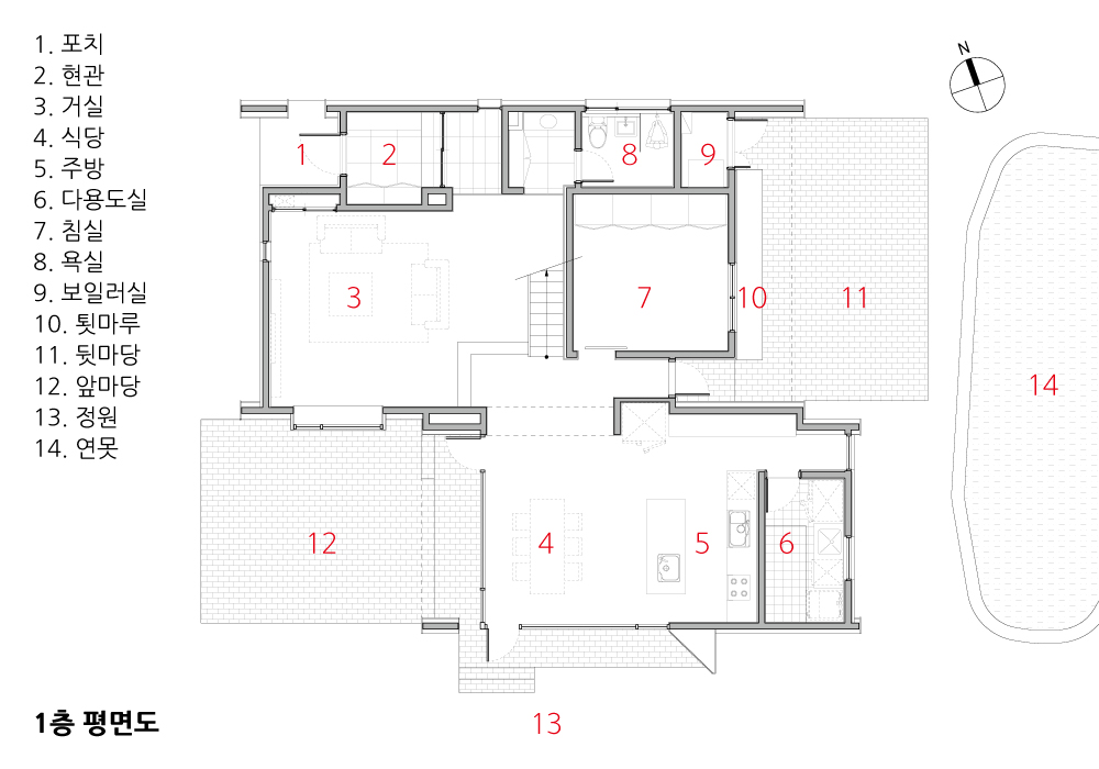 A land in a valley where darkness falls sooner than anywhere else. This land is on the hillside. The slope down from the mountain gives a bit of flatland and then flows downhill again. There's a bit of tension that could cause the energy to flow over helplessly. And it is the client couple's garden that relieves the tension. The bright and straightforward green they carefully take care of and the bright and cheerful vitality inside the garden keep the land's balance and gathers energy. A land that has inherent anxiety caused by the slope but presents romantic scenery. You can enter this place only after crossing a small stream. When you cross the stream, there is a small natural pond that is breathing healthily inside.