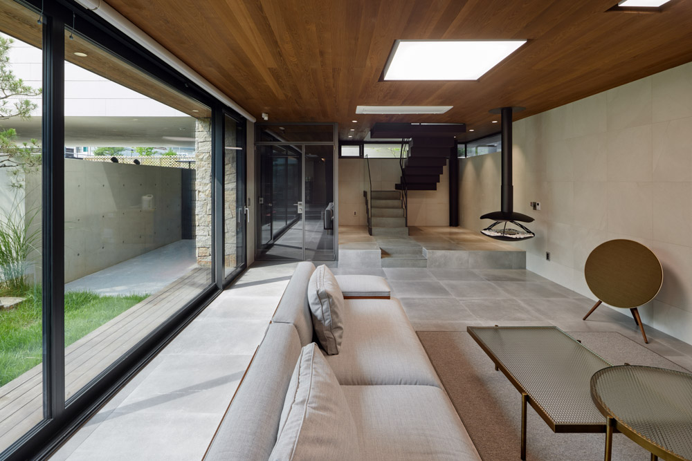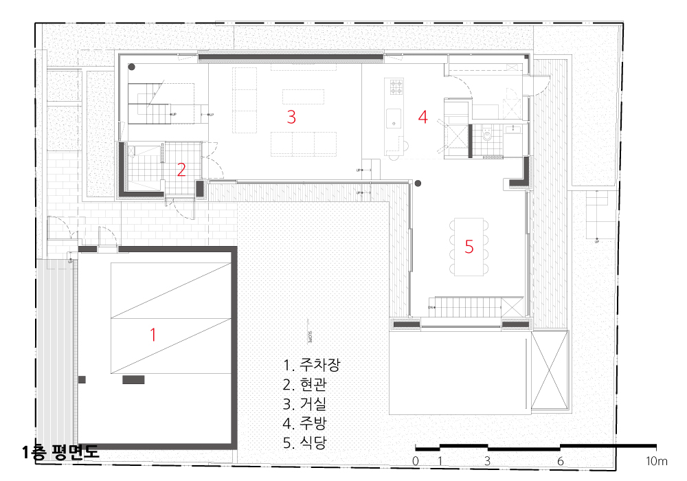 1층엔 거실과 식당·주방, 계단실, 화장실, 다용도실, 현관을 배치했다. 거실과 식당·주방, 계단실은 단 차이를 두어 영역을 구분하되, 시각적으로는 연결되어 1층이 넓어 보이도록 했다. 유틸리티실들은 각각의 박스로 구획하고, 다른 마감재를 사용함으로써 주기능들과 시각적으로 분리했다. 또한 중정의 자연과 채광을 실내로 끌어들이고 개방감을 극대화할 수 있도록 거실에 전창을 계획했으며, 내·외부 간의 경계를 허물기 위해 거실 내부천장마감이 중정측 외부 처마까지 연장되도록 했다.