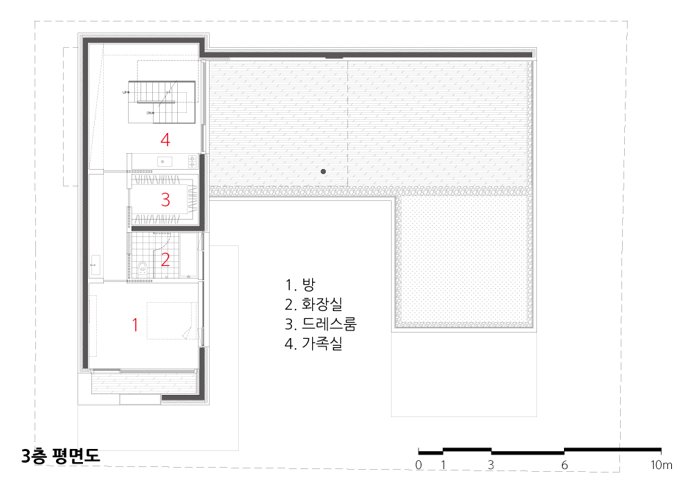 3층은 건축주의 침실과 욕실을 배치했다. 계단실이 무창실로 구획되어 답답해지지 않도록 상부에 고측창을 두었다. 계단실에서 침실로 진입하면 한강이 내려다보일 수 있도록 창을 계획했으며, 창 앞에 생기는 외부테라스는 수공간을 겸용하여 사용할 수 있도록 구성했다. 침대는 산 쪽으로 배치하고, 발코니를 두어 외부와의 버퍼공간을 주었다. 욕조 상부에 천창을 두어 수직적 개방감을 주며, 자연채광을 유입시켰다.