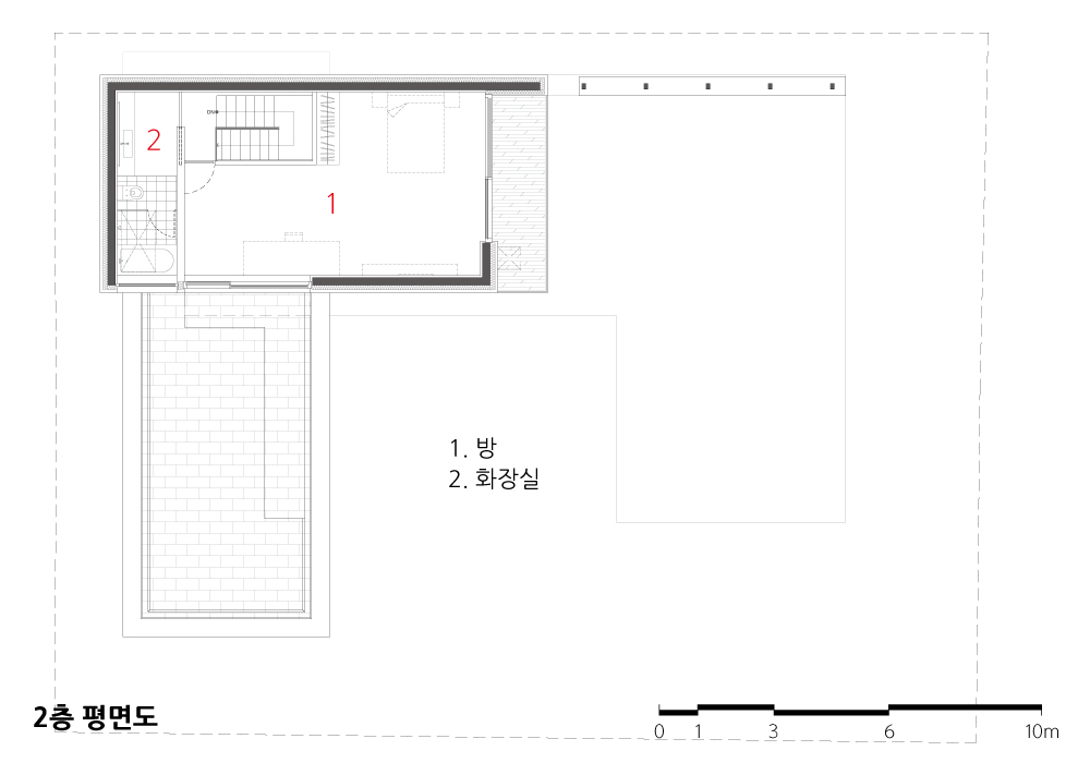 2층은 개인공간과 공용공간을 슬라이딩도어로 분리했다. 개인공간에는 침실과 욕실, 드레스룸을 배치했다. 침실과 욕실에는 중정을 향한 창을 두어 중정과 시각적 연계가 가능하도록 했으며, 한강이 보이는 전용테라스를 두었다. 공용공간에는 넓은 공용테라스와 연계하여 사용할 수 있는 보조주방을 계획했다.