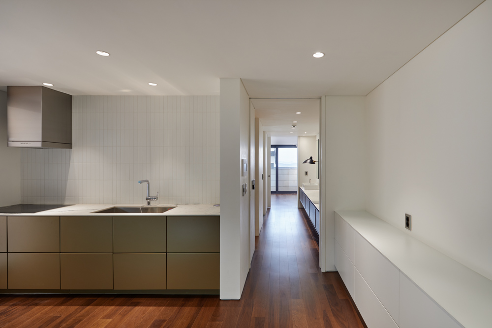On the second floor, private and public spaces are separated by sliding doors. The personal areas include the bedroom, bathroom, and dressing room. In the bedroom and bathroom, windows facing the courtyard are installed to be visually connected with the yard, and there is a private terrace overlooking the Han River. In the shared space, a sub-kitchen is designed to communicate with the large shared terrace.