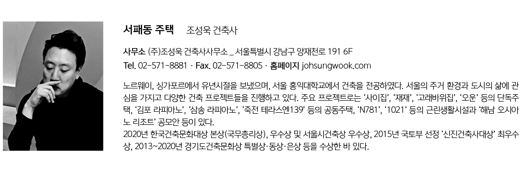 Seopae-dong House Architect | Joh, Sungwook _ JOHSUNGWOOK Architects Client | Kim Youngchul Supervisor | Joh, Sungwook _ JOHSUNGWOOK Architects Construction | TAEIN Construction Project team | Kim, Yeonhee / Paik, Sunhyung / Kang, SeonHwan Location | 173-40, Dolgoji-gil, Paju-si, Gyeonggi-do, Korea Program | House Site area | 450.00㎡ Building area | 179.73㎡ Gross floor area | 308.32㎡ Building to land ratio | 39.94% Floor area ratio | 50.77% Building scope | B1 - 3F Structure | RC Exterior finishing | Lime stone, Leopard stone, Exposed concrete Interior finishing | Water paint Design period | Oct. 2016 – Jan. 2018 Construction period | Dec. 2017 – Jan. 2020 Photograph | Roh, Kyung Structural engineer | Teo Mechanical engineer | DAEKWANG ENGINEERING Electrical·communication·Fire engineer | DAEAHE&C Fire engineer | Jokyongsanghoi |