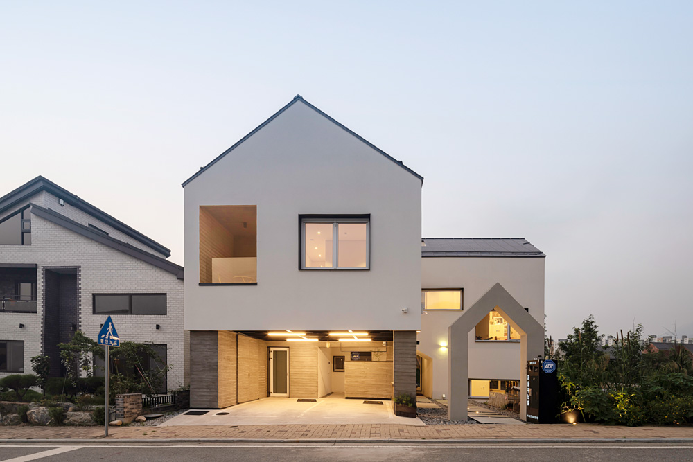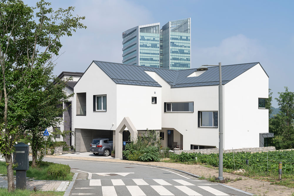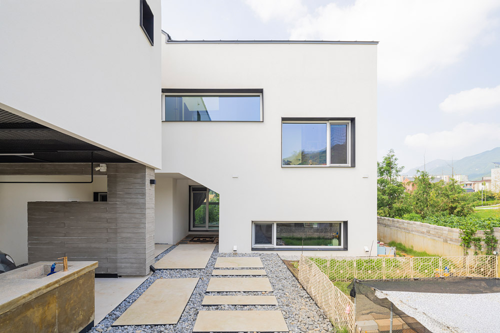 The site in the Innovation City in Wonju-si, Gangwon-do, where housing complexes are being built, has Mt. Chiak in the east and a park in the south and the north. The house is arranged in a ‘ㄱ’ shape, giving a sense of openness by considering the view of the surrounding landscape while securing privacy with the courtyard, yard, and shielding plants.