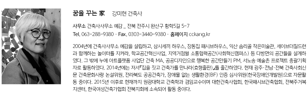 | 꿈을 꾸는 家 설계자 | 강미현 _ 건축사사무소 예감 건축주 | 김수연, 유승래 감리자 | 강미현 _ 건축사사무소 예감 시공사 | (주)그리크지않은집 설계팀 | 김우철, 정하진, 기혜진, 김준원, . 강신용, 서로사, 이주람 대지위치 | 강원도 원주시 달마중3길 23 주요용도 | 단독주택 대지면적 | 282.60㎡ 건축면적 | 112.11㎡ 연면적 | 184.18㎡ 건폐율 | 39.67% 용적률 | 65.17% 규모 | 지상 2층 구조 | 철근콘크리트구조, 일반목구조 외부마감재 | 외벽 _ 스타코(파렉스코리아), 송판노출콘크리트 미장 지붕 _ 징크(덕신코리아.주) 내부마감재 | 벽지 _ 코스모스 합지, 마루 _ 노바 와이드오크, 테라코빈티지 마감, 자작합판 등 설계기간 | 2018. 11 - 2019. 04 공사기간 | 2019. 06 - 2019. 12 사진 | 김성철 구조분야 : (주)두항구조안전기술사사무소 기계설비분야 : 대신기술단, 양지시스템 전기·소방분야 : 대신기술단 |