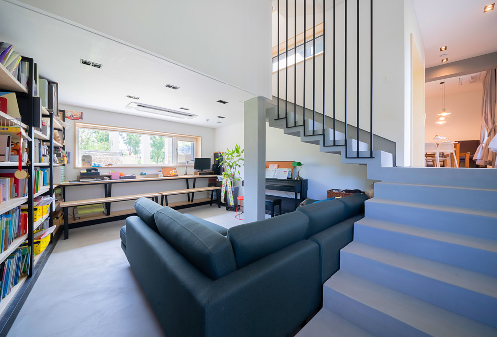 The most significant feature of ‘The House of Dreams’ is the skip-floor structure and circulation. The kitchen is on the left of the entrance, and the living room is down a half-floor after the courtyard. The children’s room is a half-floor up, and it is also designed to be accessible from the second floor with a level difference. It can be used as a separate space for the children in the future when they become adults.
