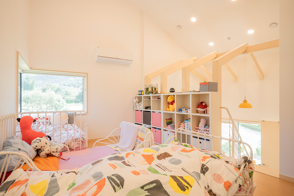 The kitchen, the wooden bench on the 2nd floor, and the living room are shared spaces. It becomes a space where the father, the mother, and their three siblings can read books or have a conversation together. The living room is designed to have bookshelves all around the wall, which is reminiscent of the images of libraries and book cafes. The living room, which is half a story lower than the yard, secures privacy from the outside with sunlight from the south and allows Mt. Chiak and the park through corner windows in the east and the north. On the second floor, a small shared space is designed to be circulated by placing a bench so that the entire house could become a play space for the three siblings. Indoor and outdoor circulation follows the children. The three siblings' room becomes a play space or a rest space to build memories along with the inner space. The windows on the east, south, and north are designed to secure light and view to be a warm space completed with an eco-friendly wooden finish.