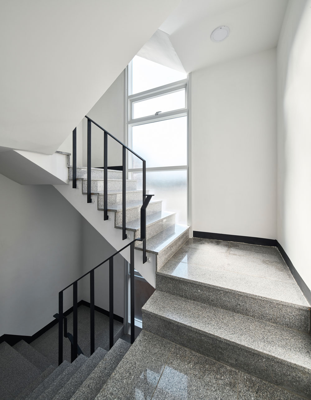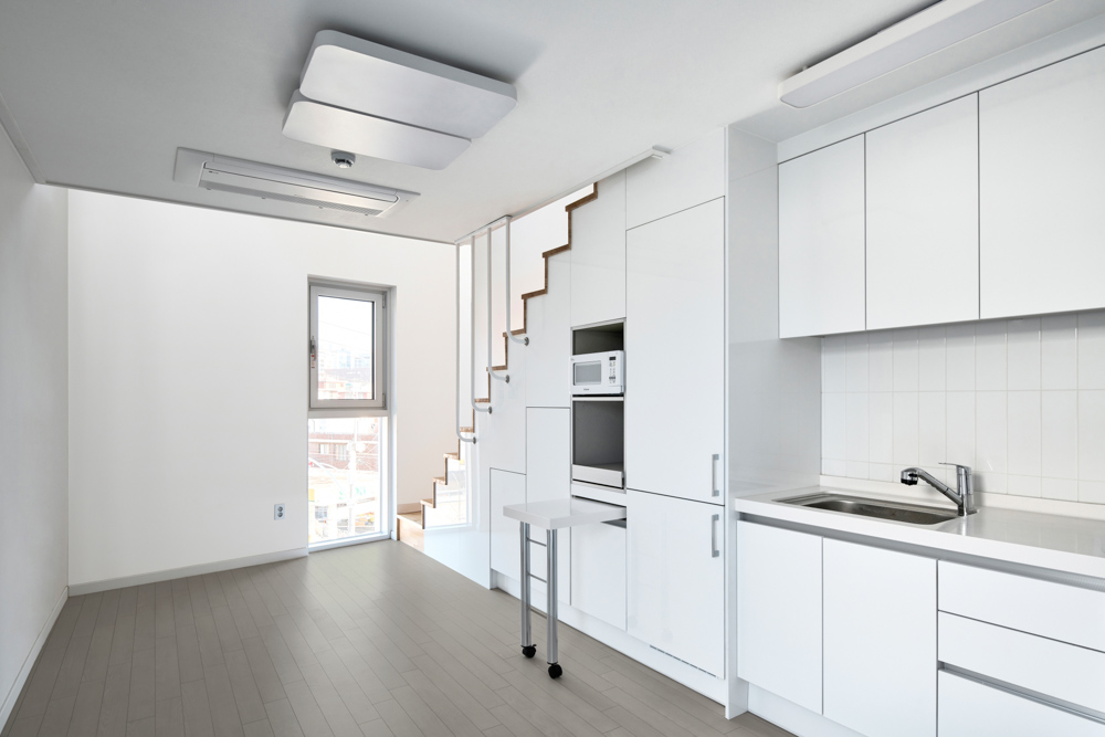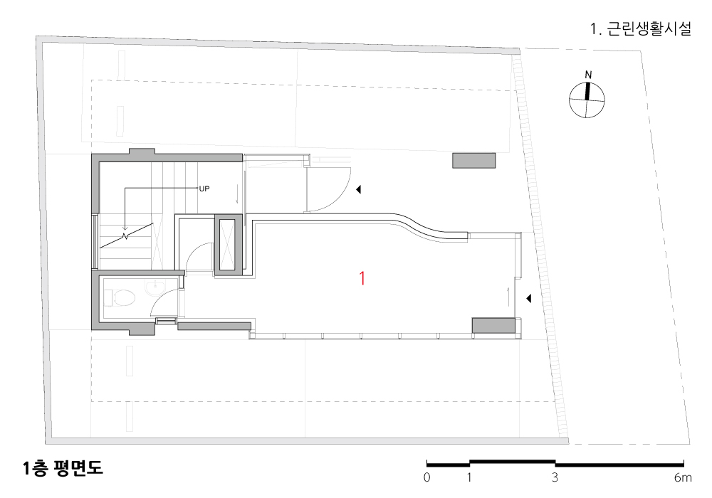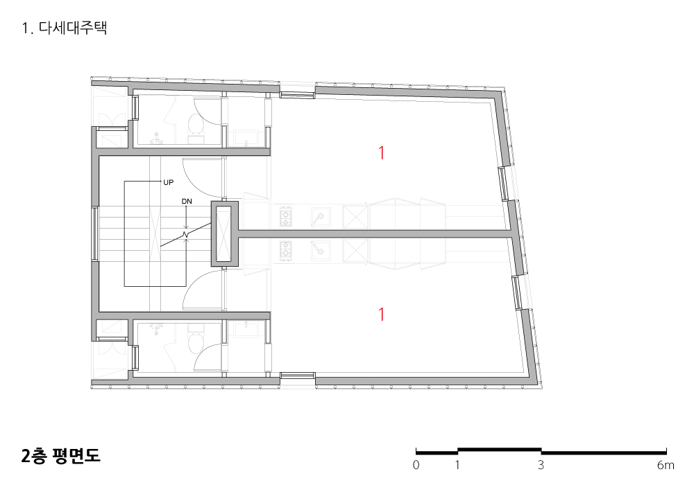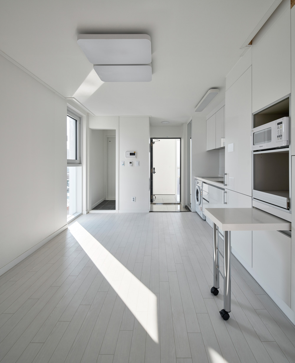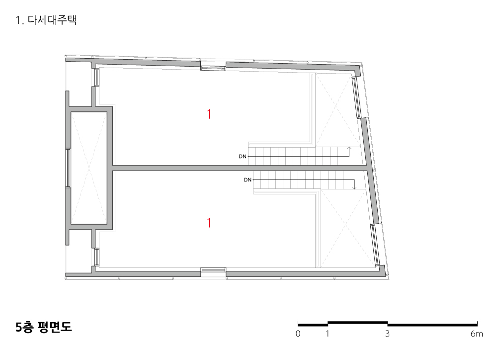 대지는 남북 방향으로 약 10% 정도의 경사가 있는 동서 방향의 긴 형태로, 일조에 유리한 조건을 가지고 있었다. 다만 차로로부터 소음 등에 직접적으로 노출돼 있어 이를 차단할 수 있는 대책이 필요했다. 1층에는 작은 소매점으로 이용될 근린생활시설을 배치하고 2층부터 5층까지 다세대주택 6세대를 배치했다. 4~5층에는 한 세대가 2개 층을 이용하는 ‘복층형 타입’ 2세대를 마련했다. 면적이 작은 대지의 특성상 콤팩트(compact)한 평면이 반복되도록 계획해 이용자가 공간을 효율적으로 이용하도록 의도했다.