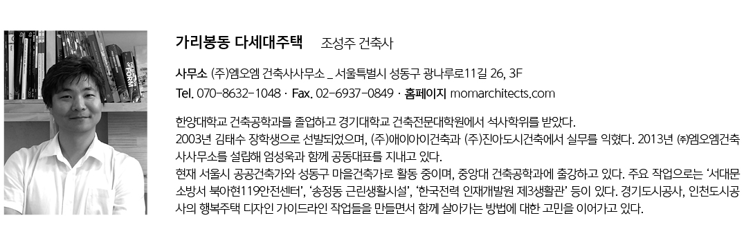 | 가리봉동 다세대주택 설계자 | 조성주 _ (주)엠오엠건축사사무소 건축주 | 고창우, 김선희 감리자 | 조성주 _ (주)엠오엠건축사사무소 시공사 | 와이엠종합건설(주) 설계팀 | 엄성욱, 이지현, 최석희 대지위치 | 서울특별시 구로구 구로동로 21-2 주요용도 | 공동주택(다세대 주택) 대지면적 | 142.00㎡ 건축면적 | 69.31㎡ 연면적 | 280.58㎡ 건폐율 | 48.81% 용적률 | 197.59% 규모 | 지상 5층 구조 | 철근콘크리트구조 외부마감재 | 알루미늄 익스펜디드메탈, 불소수지 도장 내부마감재 | 합판 위 수성페인트, 강화마루 설계기간 | 2017. 02 - 2017. 08 공사기간 | 2020. 04 - 2020. 11 사진 | 최진보 구조분야 : (주)허브구조 엔지니어링 기계설비분야 : 이래엠이씨 전기분야 : 성지이앤씨 소방분야 : 이래엠이씨, 성지이앤씨 |