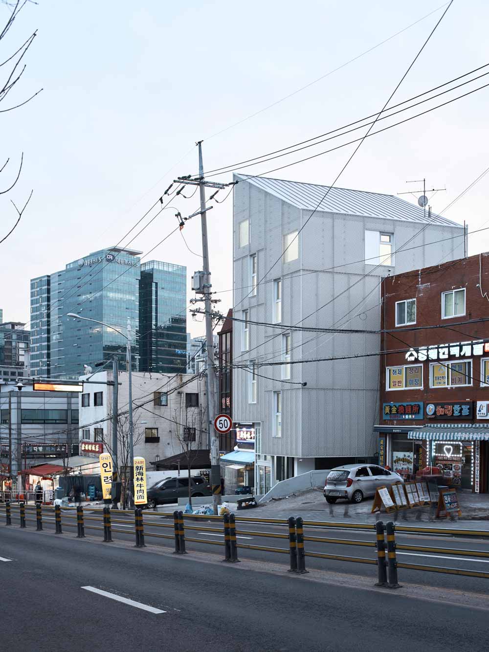 건물 매스와 입면은 우선 최대한 ‘단순하게’ 형태를 만들고, 주변의 복잡하고 무질서한 환경과 대비되는 ‘질서’와 ‘리듬’이 있는 규칙적인 그리드(grid) 패턴을 변형해서 적용하여 단아한 입면이 되도록 구성했다. 이를 위해 외장 재료로는 비교적 단단한 금속 재질이자 반투명한 성격이 있는, 그러면서도 표면에 깊이감을 줄 수 있는 ‘익스펜디드 메탈(Expanded Metal)’을 적용했다. 익스펜디드 메탈로 하나의 ‘레이어(layer)’가 추가된 표면은 마치 부드럽고 얇은 천을 두른 것처럼 반투명하게 어른거리는 느낌을 자아낸다.