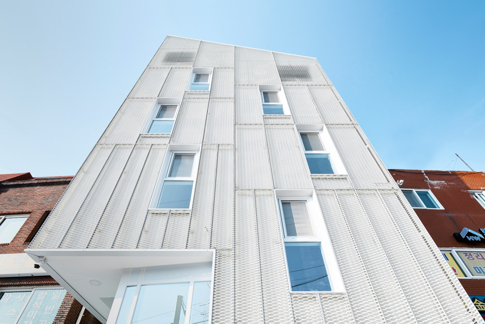 The building mass and elevation are as simple as possible. In contrast to the surrounding complex and disordered environment, regular grid patterns with 'order' and 'rhythm' are transformed and applied to form the elegant elevation. For this purpose, 'Expanded Metal', relatively hard metal material with translucent properties and gives a sense of depth to the surface, was applied as an exterior material. The surface added with a single 'layer' of expanded metal is translucent and shimmering as if wrapped in a soft, thin cloth.
