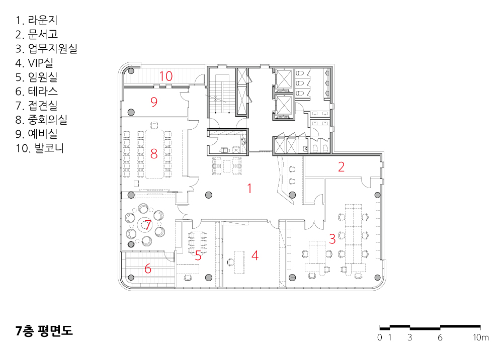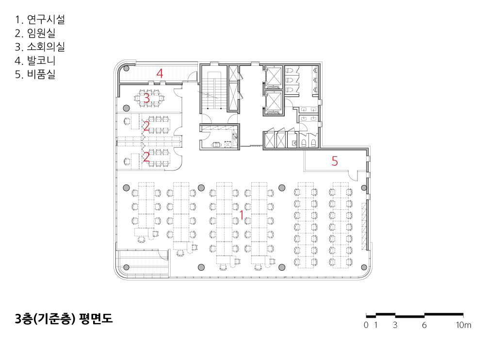 또한, 건축물의 후면에도 발코니를 설치함으로써 외부에 접하는 공간을 최대한 확보하여 업무의 쾌적성을 확보하고자 하였다.