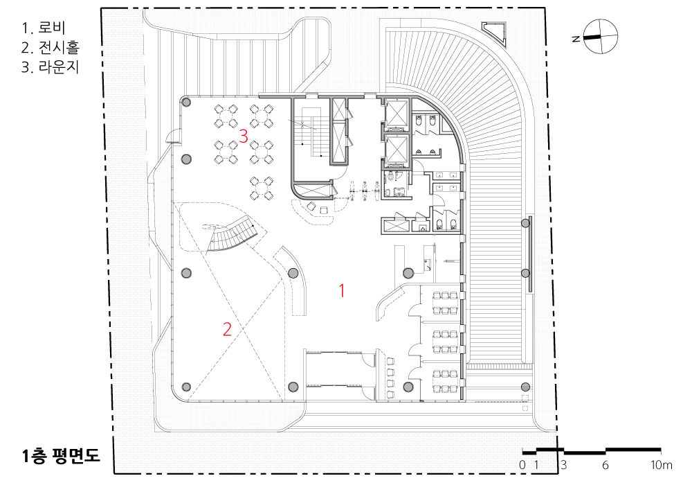 가로에 면한 입면은 커튼월로 구성하되, 수평 루버를 사용하여 입면과 가로경관에 변화를 주고자 하였다.