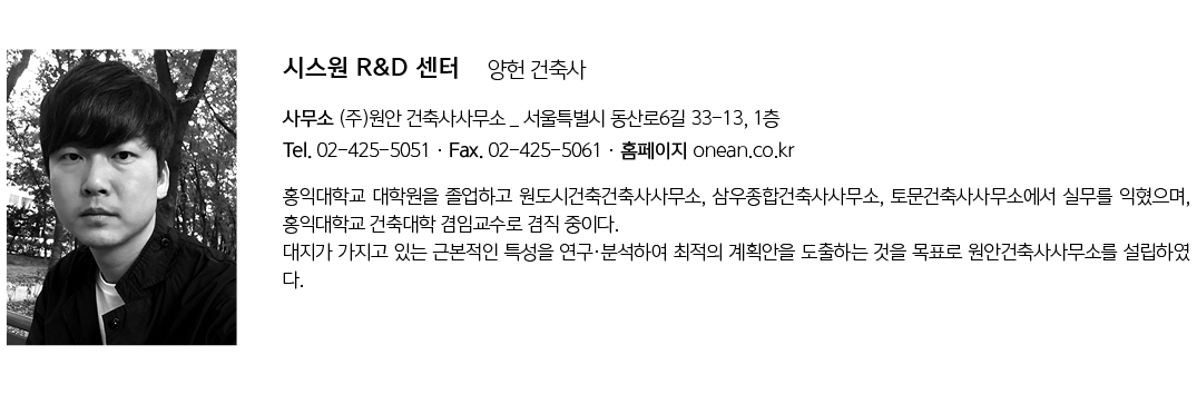 | 시스원 R&D 센터 설계자 | 양헌 _ (주)원안 건축사사무소 건축주 | (주)시스원 감리자 | 양헌 _ (주)원안 건축사사무소 시공사 | (주)종하아이앤씨 설계팀 | 김정태, 이민수 대지위치 | 서울특별시 강서구 마곡중앙14로 26 주요용도 | 교육연구시설 대지면적 | 1,071.90㎡ 건축면적 | 607.27㎡ 연면적 | 5,406.46㎡ 건폐율 | 56.65% 용적률 | 348.83% 규모 | 지하 2층, 지상 8층 구조 | 철근콘크리트구조 외부마감재 | 알루미늄 복합 패널(스파클링 화이트), 성형 커튼월 내부마감재 | 대리석, 석고보드 설계기간 | 2018. 02 - 2018. 10 공사기간 | 2018. 11 - 2020. 04 사진 | 김용수 _ 마실와이드 구조분야 : 엔알씨구조 기계설비분야 : 해박엔지니어링 전기분야 : 천일엠이씨 소방분야 : 해박엔지니어링, 천일엠이씨 인테리어분야 : (주)원안 건축사사무소, 성창에스앤디(주) |