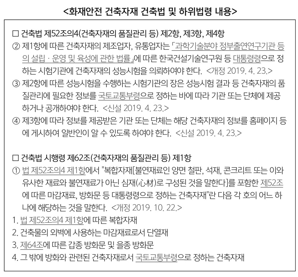 올 하반기 12월 23일부터는 건축법 개정으로 화재안전 건축자재 품질관리와 기준이 대폭 강화된다. 건축물 내외벽 마감재료와 단열재, 복합자재 등에 준불연 성능 이상의 자재 사용을 의무화한 것이다.
