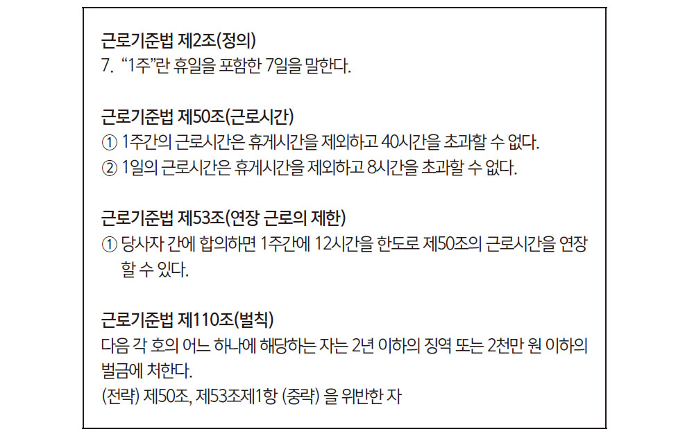 주 52시간은 1주 40시간의 법정근로시간에 12시간의 연장근로시간을 더한 시간으로, 근로기준법에 따르면 1주 최대 52시간까지만 근로할 수 있다. 근로자의 청구나 동의가 있다고 하더라도 이러한 법정 근로시간의 한도를 초과하여 근로할 수 없다.