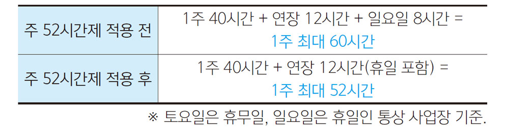 현재 5인 이상 사업(장)은 모두 주 52시간제가 적용되기 때문에, 사업장에서 휴일(예 : 일요일)을 포함하여 총근로시간이 주 52시간(예 : 소정 40시간 + 연장 12시간)을 초과할 수 없도록 소정근무 외 연장근로를 1주 12시간 내에서 관리해야 하고, 근로기준법을 통해 인정되는 다양한 제도를 활용할 필요가 있다.